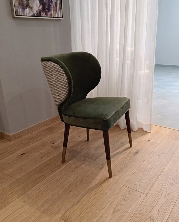 Zelena boja unosi svežinu i prirodnu harmoniju u prostor. Fotelja Lola New u zelenom štofu lako se uklapa u moderne enterijere i daje prostoru poseban karakter. Kombinacija zelene tkanine i drvenih detalja stvara toplu i prijatnu atmosferu.