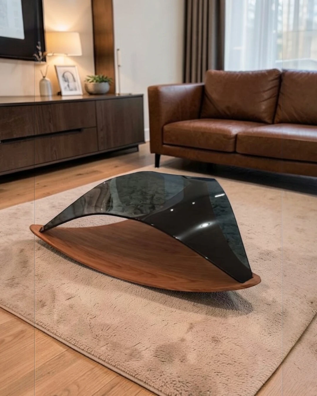 Baza od zakrivljenog furnira oraha dodatno naglašava prirodnu toplinu i luksuz ovog modela, čineći ga savršenim spojem stakla i drveta.